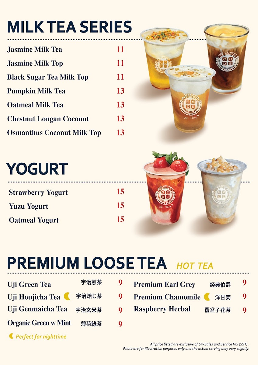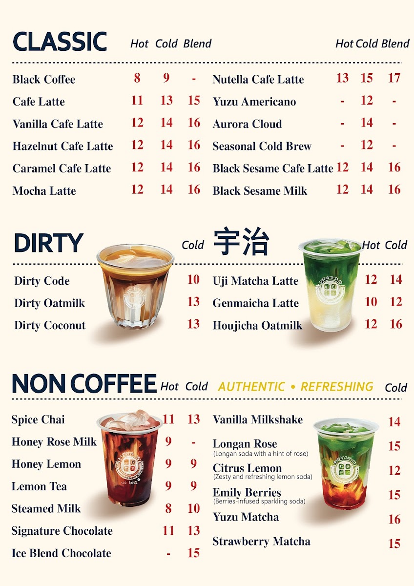 - Specialty beverages such as Asian Flower Matcha Latte, Strawberry Matcha Latte, Avocado Smoothie, Horlicks Oat Milkshake, and Code