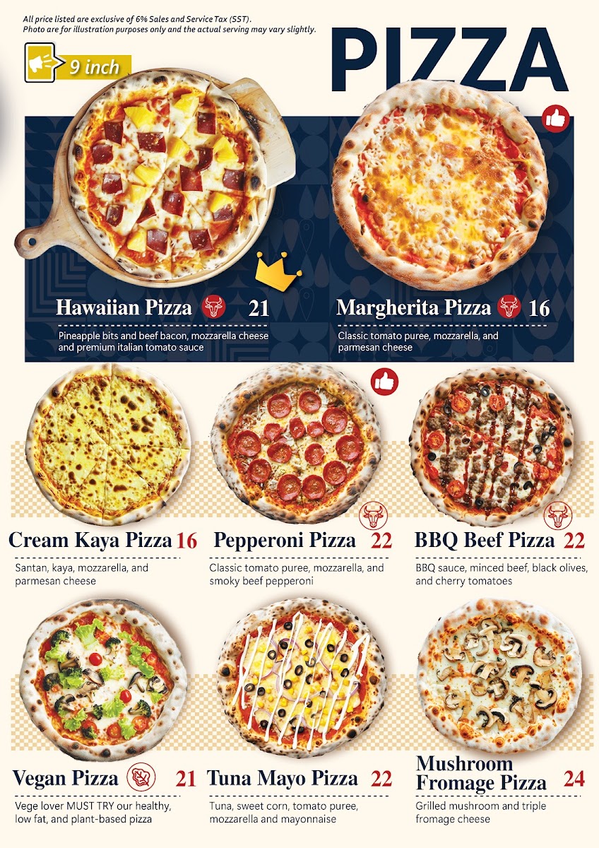 - Varieties including Hawaiian Pizza with pineapple and beef bacon, Margherita Pizza with classic tomato and cheese, Pepperoni Pizza, Veggie Pizza, and BBQ Beef Pizza